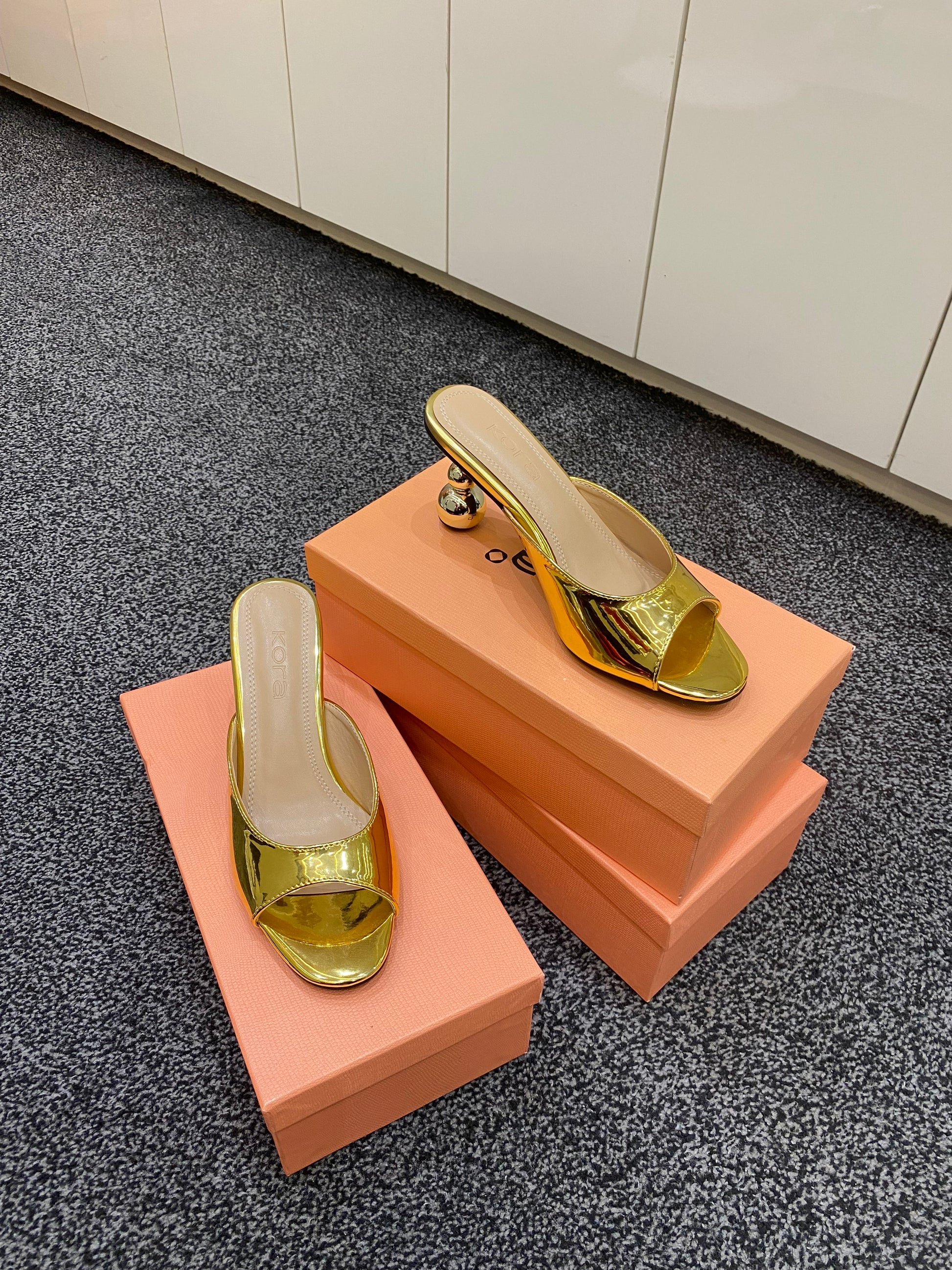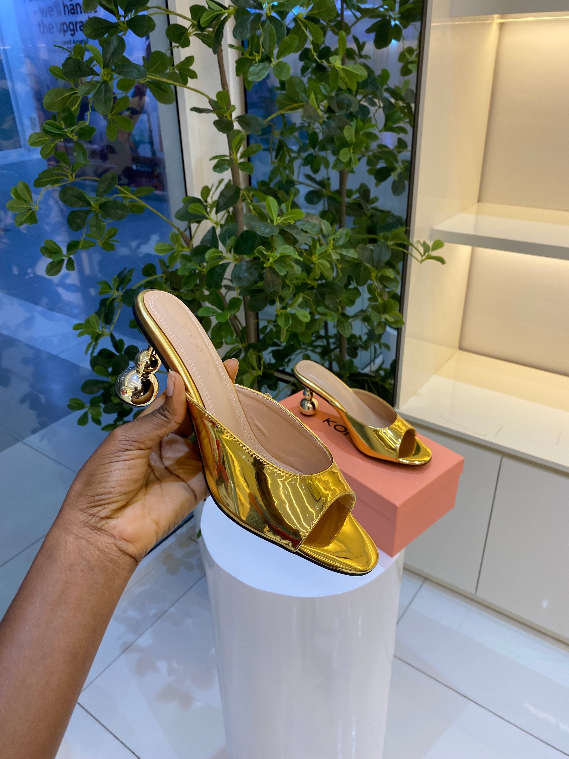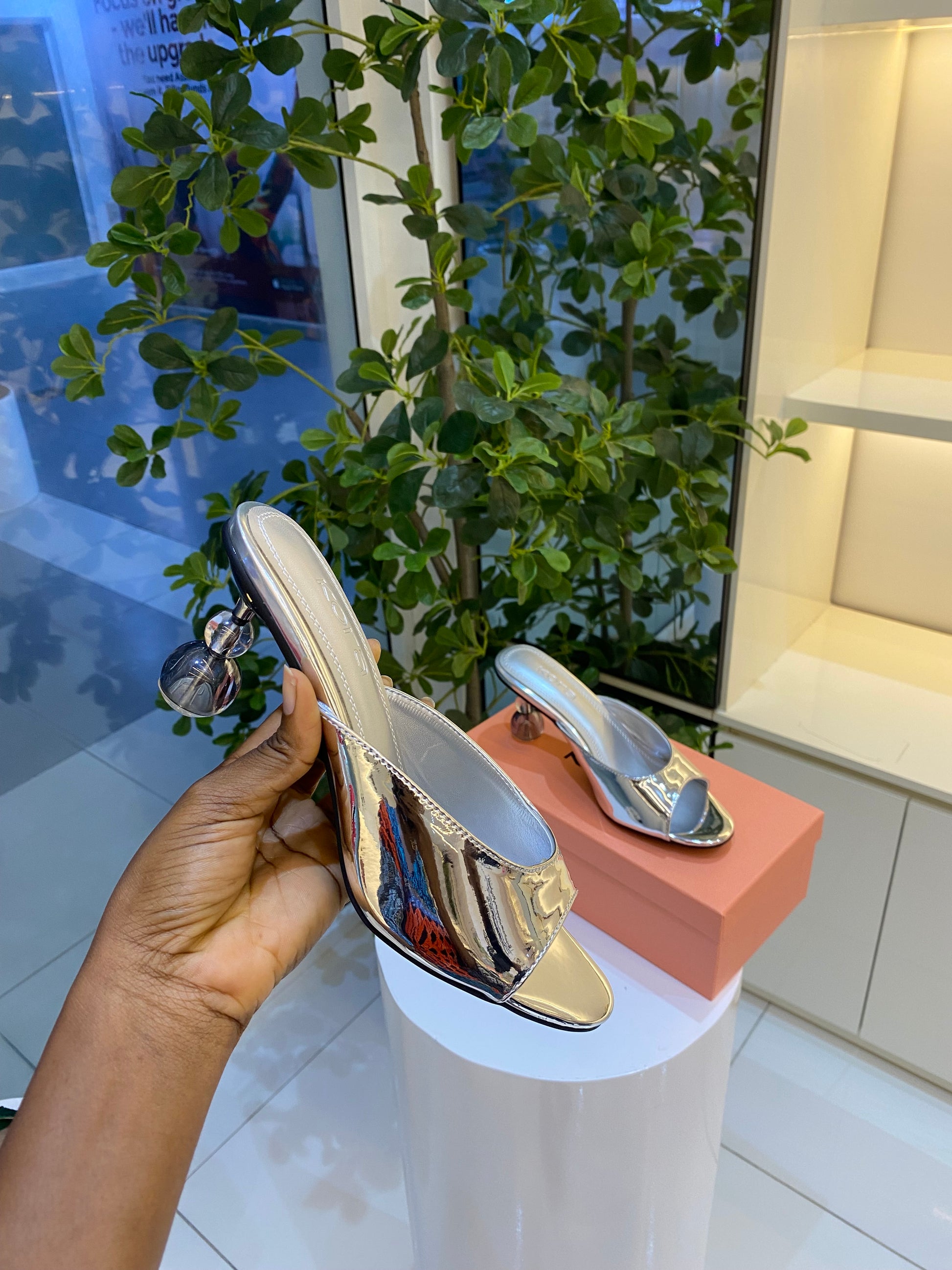 Step into bold elegance with these striking Gaze metallic heels from Kora shoes. Designed for women who love effortless glamour and standout style. Featuring a smooth metallic upper, sleek open-toe design, and a unique sculpted glass heel, these slip-on sandals bring a modern luxury finish to both day and evening looks.